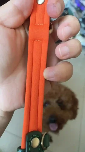 Collier cuir orange/vert trop stylé pour mon caniche ! Gravure prénom + tél claire, ajustement parfait. Doux et solide, il adore. Look unique !